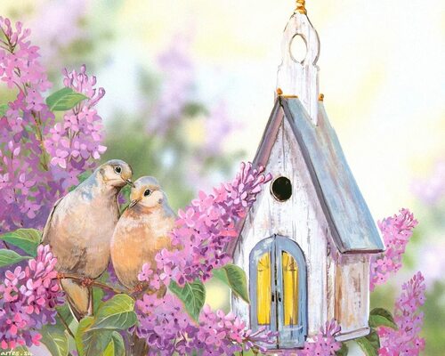 Птицы на цветущей ветке живопись