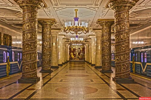 Станция "Автово" впечатляет своими мозаичными панелями, изображающими рабочих и колхозниц, а также уникальными световыми конструкциями, создающими особую атмосферу.