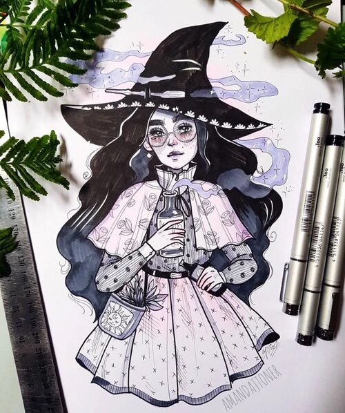 Представьте себе величественную ведьму, летящую на метле по ночному небу. Успейте запечатлеть это магическое мгновение на бумаге с помощью маркеров. Вы можете использовать разные оттенки, чтобы добавить глубину и объем изображению.