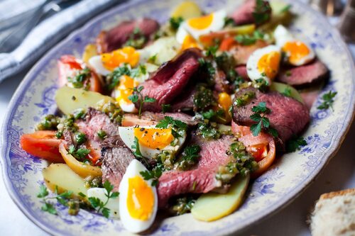 5. Подавайте мясные салаты охлажденными или комнатной температуры, украшенными зеленью или крупно нарезанными овощами.