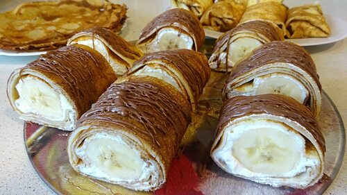 Рулетики из блинчиков с творожно–банановым кремом