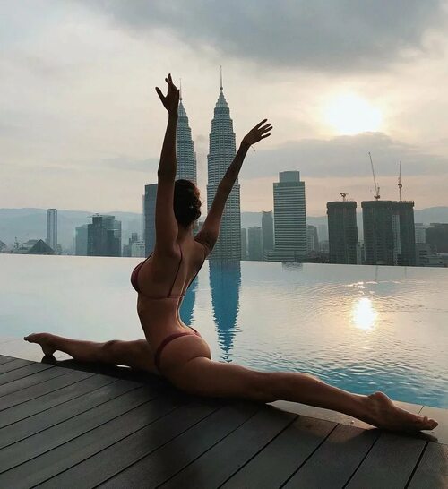 На последней фотографии мы видим девушку, выполняющую шпагат на фоне великолепного городского пейзажа. Ее грация и сила привлекают взгляды прохожих, а фон добавляет драматизма и красоты.