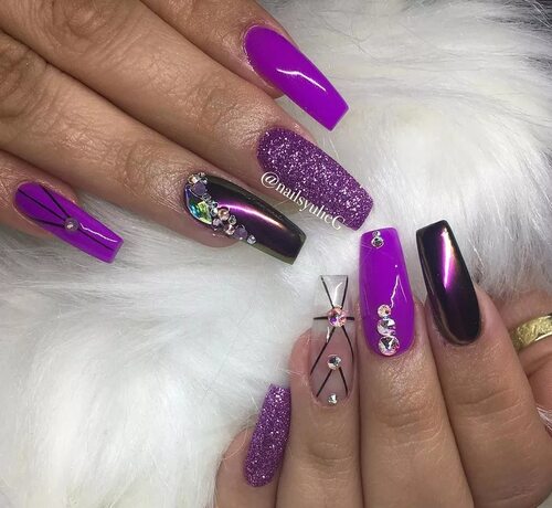 Создайте на своих ногтях настоящие произведения искусства с помощью сиреневых фресок. Вы можете выбрать готовые наклейки или нарисовать узоры с помощью тонкой кисточки и специальных лаков. Этот стиль подойдет для тех, кто хочет выделиться и произвести впечатление своим маникюром.